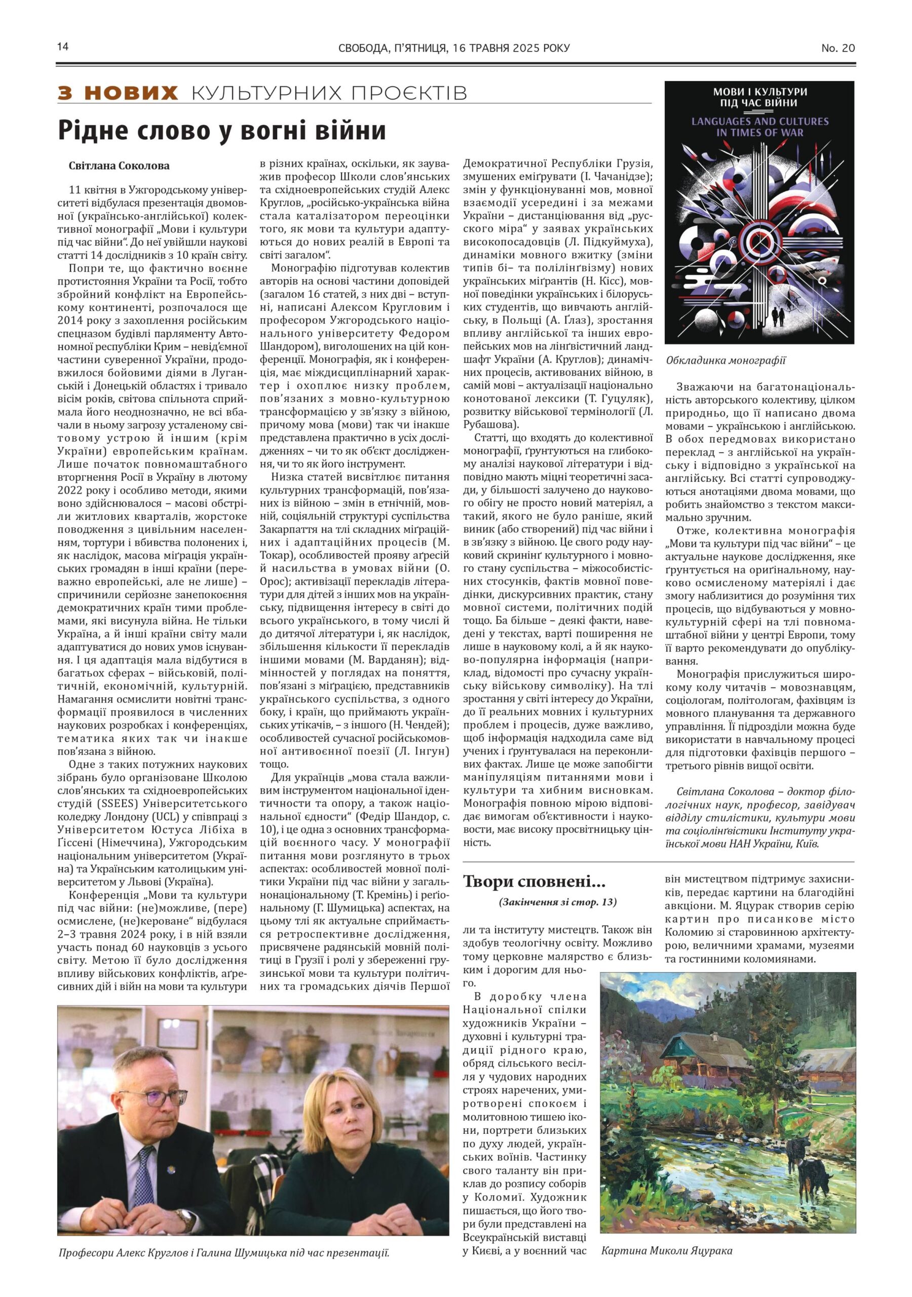 «Рідне слово у вогні війни» — статтю під такою назвою в газеті “Свобода” опублікувала професор Світлана Соколова, доктор філологічних наук, завідувач відділу стилістики, культури мови та соціолінгвістики Інституту української мови НАН України, про нещодавно презентовану колективну монографію «Мови і культури під час війни».